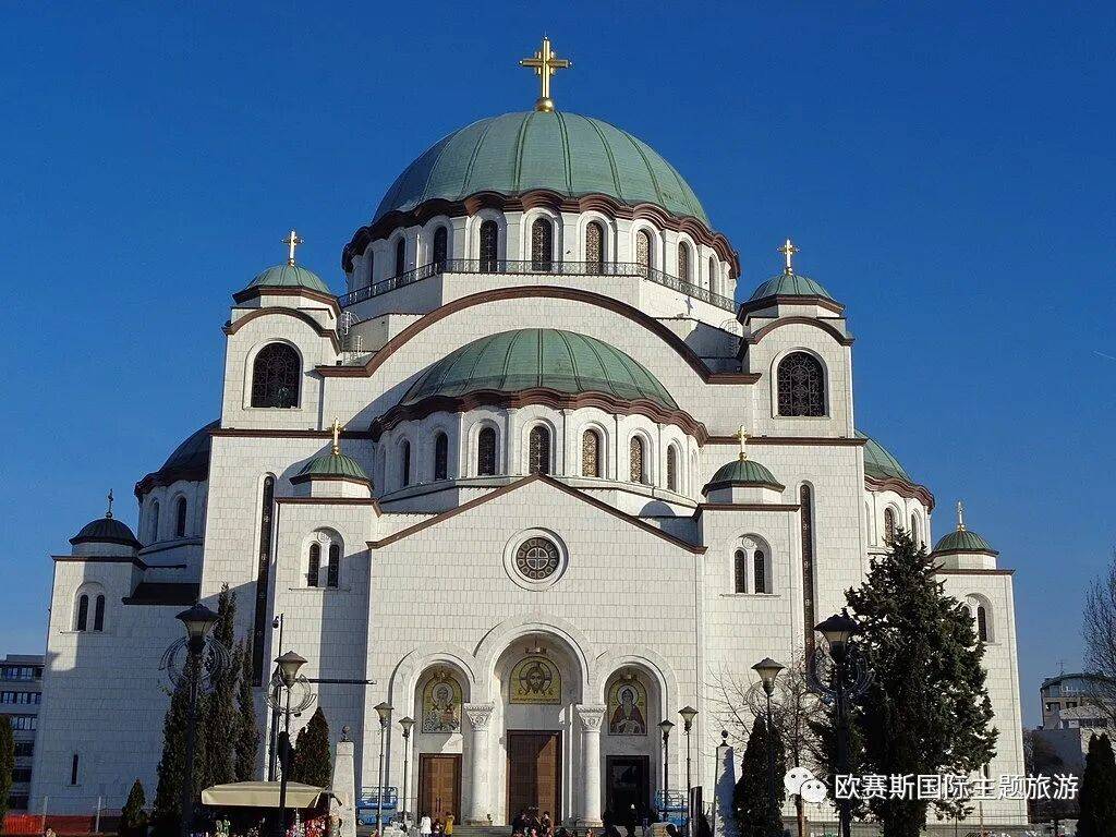是位于贝尔格莱德的一座东正教教堂,是巴尔干半岛最大的东正教教堂,同时也是世界上最大的东正教教堂。圣萨瓦教堂是为了纪念圣萨瓦而建立的,圣萨瓦为塞尔维亚中世纪的著名人物,是塞尔维亚东正派教堂的创立者。圣萨瓦教堂是贝尔格莱德最大的纪念性建筑,总占地3500平方米,采用了东正教常用的拜占庭式设计。教堂通体以纯白色大理石堆砌而成,晶莹坚固的质地确保了教堂的稳固与高大,也象征了教会的威严、圣洁和不可侵犯。教堂的圆屋顶高70米,教堂的主体采用了四边基本等长的正十字形状,东西91米,南北81米,这就使得教堂自任何角度看去均显方正整齐,宏伟异常。四座钟楼均匀镶嵌于十字形的四个直角处,与教堂主建筑合为一体,甚是壮观。铁托墓地